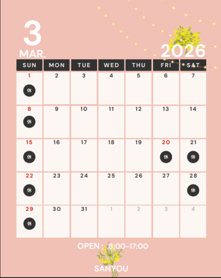 3月営業日のお知らせ2026.02.23 - Mon 営業日平素は格別のご高配を賜り心より感謝申し上げます。\\🐦3月の営業日のお知らせ🌸//3月は三連休もあります。 ご来店の際は、下記カレンダーをご確認の上、ご来店ください。■サンヨウパーツSHOP🐳 📅月~金 🕗8時~17時 ☎0581-36-3878